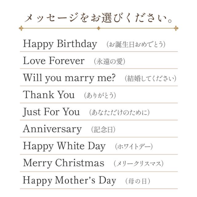 女性に喜ばれる 人気 のプレゼント、 花とアクセサリーのコラボレーションです。 全ての女性を魅了する輝きで、 記念日をロマンチックに演出します。 1. プリザーブドローズの女王「アモローサ- AMOROSA -」 稀少な天然ダイヤモンド入りのラメを花びらにまとい、 光を舞い散らせ輝く姿は、誰もが魅了される美しさ。 しっとりとした質感と、ベルベットのような光沢。 究極の美を追求した、最高級のプリザーブドローズです。 スペイン語で“愛”を意味する「アモローサ」。 専用の薔薇園で育成された バラ の中から、 色・形・大きさなどをチェック。 厳しい品質検査を受けて、基準をクリアした、 ほんの一握りの 薔薇 だけが、「アモローサ」と呼ばれているのです。 鮮やかで発色の良い 赤 色が伝える想いは、 「情熱」・「あなたを愛します」。 また、一輪の薔薇には「あなたしかいない」という意味もあるので、恋人への 告白 プロポーズ に最適。 贈った後も、インテリアとして飾っていただけるので、 日常に彩りを添えてくれることでしょう。 当店では正規の日本総代理店から仕入れた、“本物”のみを取り扱っています。 アモローサの正規商品であることを証明する 「ギャランティーカード」をお付けしております。 驚きと感動をその目でお確かめください。 2. 二人の絆を繋ぐペアネックレス「LoveRingネックレス」 カップルなら一度は憧れる、おそろいのアクセサリー。 ペアデザインのネックレスをジュエリーケースに入れて、 2人だけの忘れられない思い出と共にお届けします。 永遠の絆を表す ダブルリング のペンダントトップ。 2連 リングのうち、片方はカラーが施されており、 女性にはエレガントなピンクゴールド 男性にはシックで落ち着いたブラック ペアといっても全く同じではなく、 それぞれ色違いになっている、おしゃれなデザインです。 シルバーリングには「永遠の愛」を意味する「amore eterno」の刻印入り。 ラインストーンが一粒装飾されており、煌めくアクセントになっています。 シンプル で付ける人を選ばない、 上品な雰囲気のあるネックレスなので、 カジュアル フォーマル どんなシーンでもお使いいただけます。 ステンレス 製だから、錆びにくく、汚れにくい。 メンテナンスも必要ないので、気兼ねなく身に着けることが出来て普段使いにピッタリです。 直接身に着けるものだから、 金属アレルギー に対する不安も。 こちらはステンレス316を使用。 金属アレルギーに強い素材です。 離れていても心を繋ぐ、 2人だけのお守りのような ペアアクセサリー です。 3. お名前・日付・メッセージ彫刻 プリザーブドローズを保護するアクリルプレートには、 贈る相手のお名前・贈った日付・伝えたいメッセージを彫刻いたします。 [選べる9種のメッセージ] 特別なギフトシーンにぴったりなメッセージが8種類。 相手の事を想いながらお選びください♪ ・ Happy Birthday お誕生日おめでとう ・ Love Forever 永遠の愛 ・ Will you marry me? 結婚してください ・ Thank You ありがとう ・ Just For You あなただけのために ・ Anniversary 記念日 ・ Happy White Day ホワイトデー ・ Merry Christmas メリークリスマス ・ Happy Mother's Day 母の日 [日付 ・ お名前入れ] 日付が入ることで目にするたびに記憶がよみがえる記念のプレゼントに。 思い出に残したい日付をご指定下さい。 名入れギフト専門店の当店にて、気持ちを込めてお名前をプリントいたします。 「 どうして名前入りが喜ばれるの? 」 自分の名前が入った商品は世界にただ一つだけ。 贈った人に大事に使ってほしい、想いが伝わります。 さらにお名前彫刻はずっと消えずに残るから、 永く愛着を持って使っていただけます。 だから、「名入れギフト」は大切な人に感謝の気持ちを伝えるのにぴったりなおくりもの。 私たちは、贈られた人も贈った人もみんなが笑顔になれる商品をお届けします。 ≪こんなシーンにおすすめ≫ ・ 恋人 への 告白 プロポーズに ・ 妻 奥さん パートナー への 結婚記念日 のプレゼントとして ・ 彼女への Xmas プレゼント ホワイトデー のお返しに・ 2人の大切な記念日に |