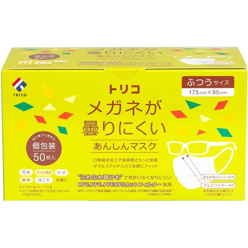 トリコ メガネが曇りにくいあんしんマスク ふつうサイズ 個包装(50枚入)[不織布マスク]