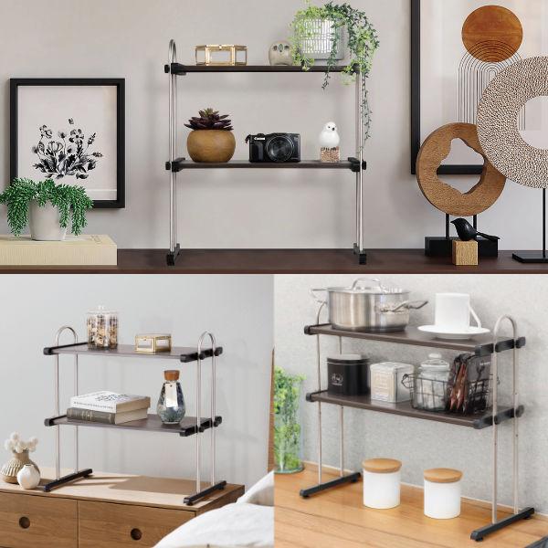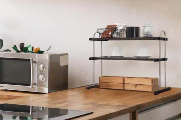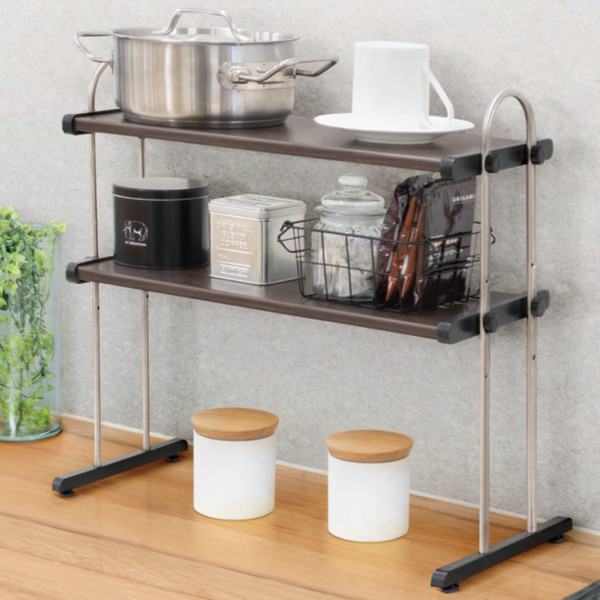 キッチンカウンターや調理台上の空間に設置して、グラスや鍋・フライパン、調味料などの収納スペースとしてお使いいただけます。縦の空間を有効活用できる2段タイプ。