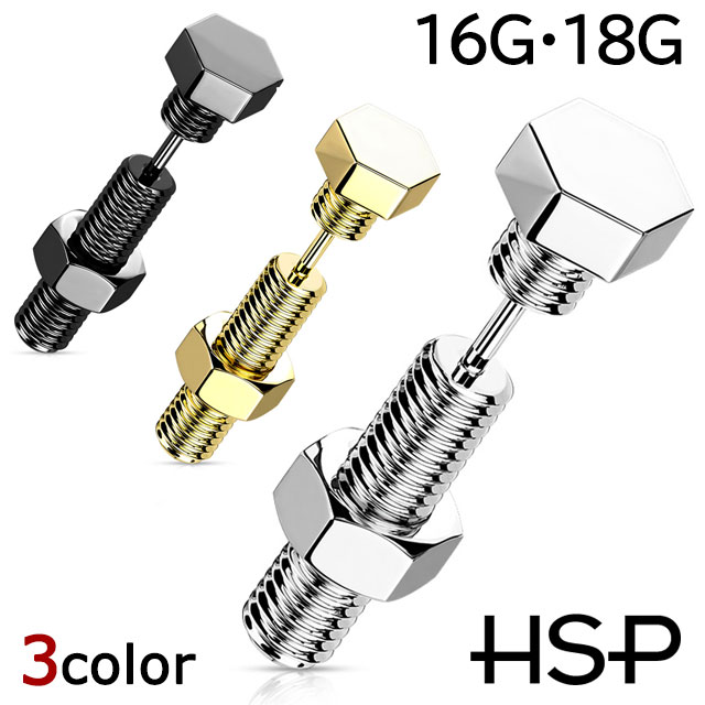 HSP ボディピアス ナット & ボルト ヘキサゴン スクリュー ヘッドストレートバーベル フェイクプラグ 16G 18G [ 軟骨ピアス 耳ピアス ヘリックス シルバー イエローゴールド ブラック 316L サージカル ステンレス ]
