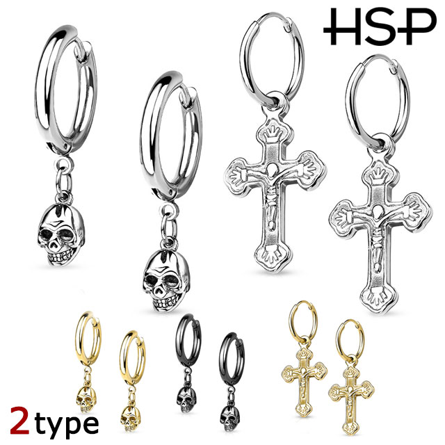 ピアス サージカルステンレス クロス/スカル ダングル フープピアス 1ペア レディース メンズ 316l ステンレス 軟骨 ファーストピアス 両耳用