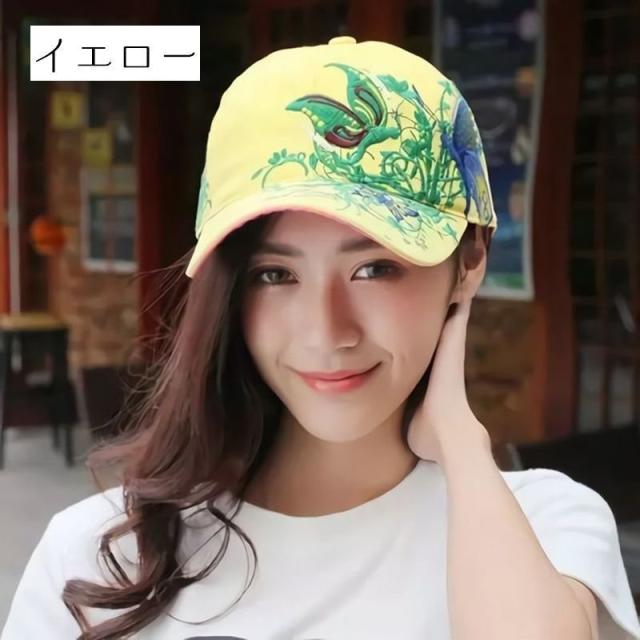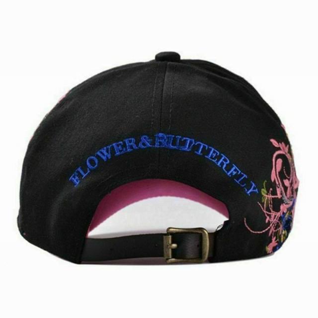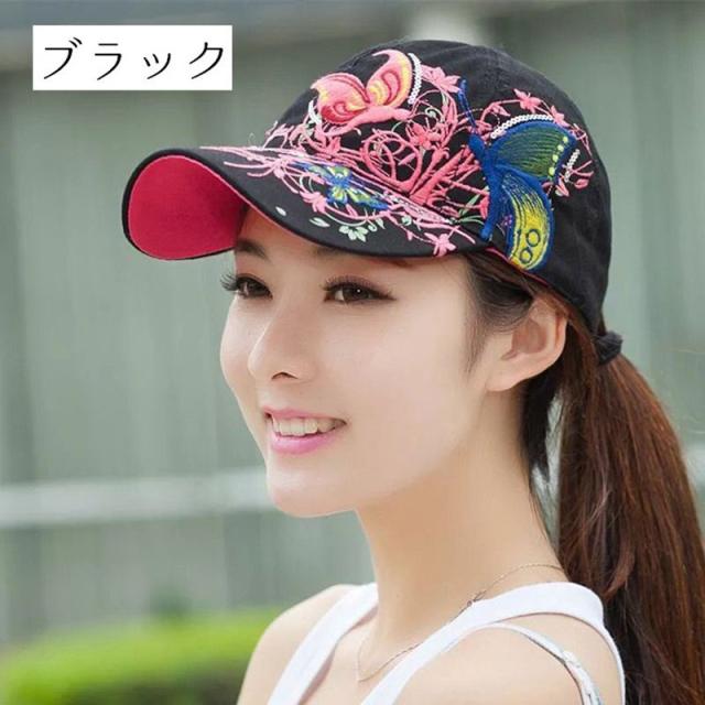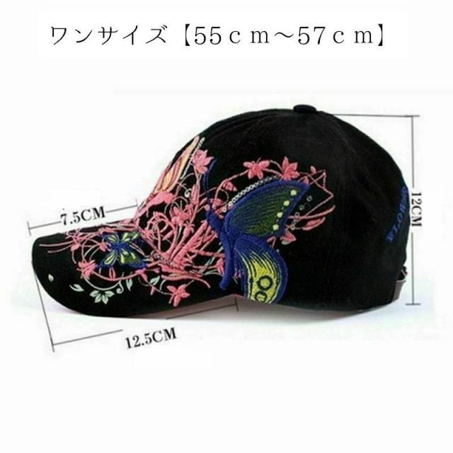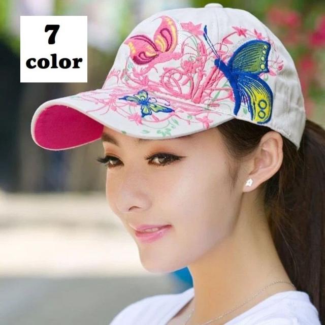 キャップ 帽子 刺繍 バタフライ 蝶 アジャスターベルト フェイクレザーベルト 英字ロゴ バックロゴ おしゃれ 可愛い 女の子 ファッション小物 レデ