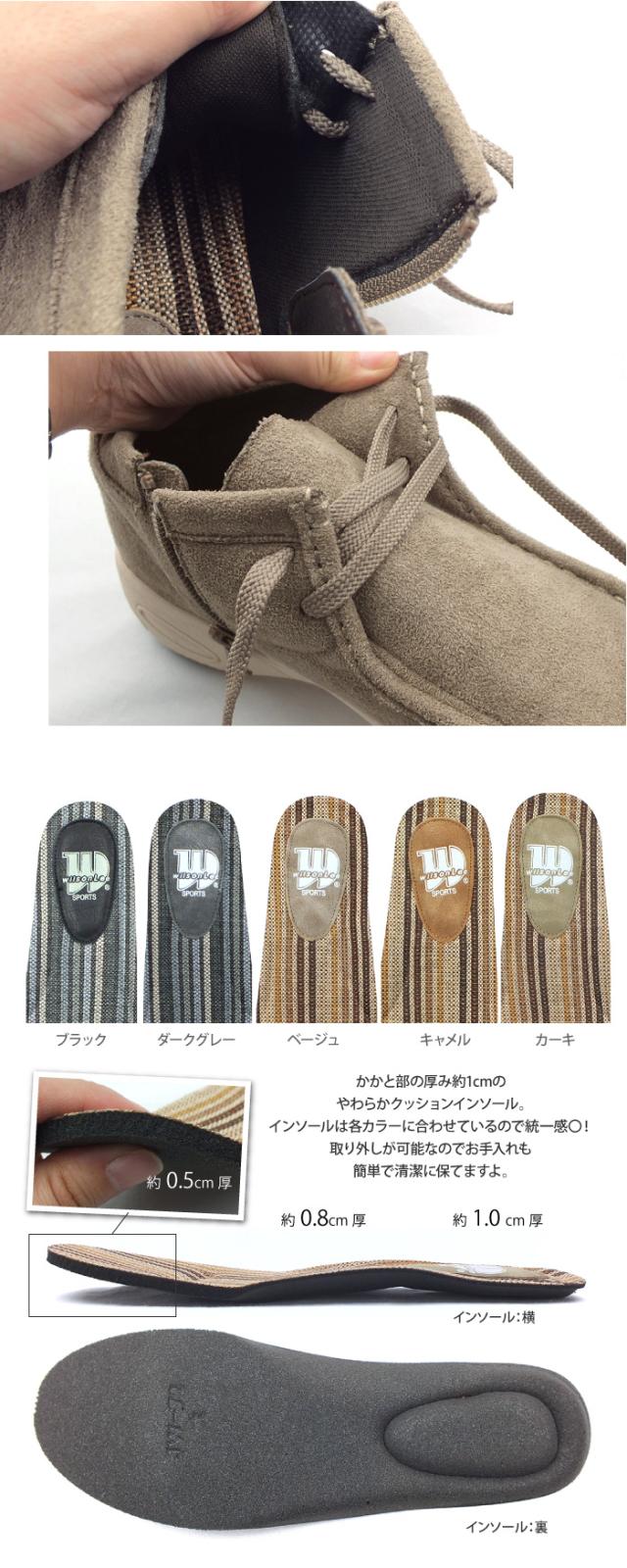 WILSON LEE SPORTS-ウィルソンリースポーツ-“足にやさしく(SOFT&FIT)”をコンセプトに、快適性を追求するシューズブランド。アッパーには上質なスウェードを採用!どんなスタイルにも合わせられる履きまわしの良さが◎ウォーキングシューズのようなソールを合わせたワラビーブーツ。レースアップデザインなので、自分に合ったお好みのホールド感に調節可能!内側にサイドファスナーが施されているので紐をほどかずとも脱ぎ履きがらくちん!インソールは取り外しが可能で、お手入れもでき清潔に保てます。屈曲性抜群のしなやかで反りの良いアウトソールなので歩行がとても滑らか。接地面から4cmは防水設計で4時間耐久!