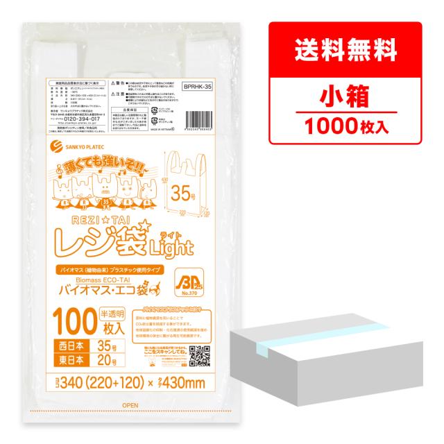 【小箱販売】BPRHK-35kobako バイオマスプラスチック使用レジ袋 西日本35号(東日本20号) 0.011mm厚 半透明 100枚x10冊 薄手タイプ ブロック有 送料無料