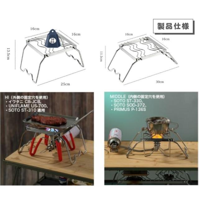 【用途】高さ2段階調整可能のクッカースタンド。木炭や薪を使ってのアウトドア調理や、バーナーを併用しての調理など多様なシーンに使えて便利。ドリッパースタンドとしても使えます。