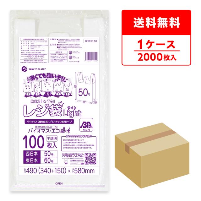 BPRHK-50 バイオマスプラスチック使用レジ袋 西日本50号(東日本60号) 0.018mm厚 半透明 100枚x20冊 薄手タイプ ブロック有 送料無料