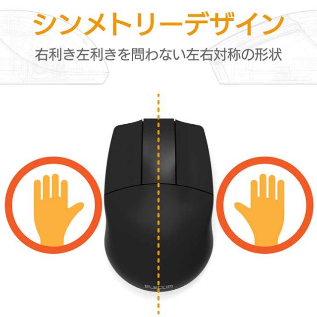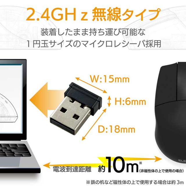共有PCなど不特定多数が触る環境でも、右利き左利き問わず使いやすい左右対称フォルム。 OMRON社製高耐久スイッチを採用し、3DCADを使用する上で便利なホイールレス無線3ボタンBlueLEDマウス。■インターフェイス:USB ■コネクタ形状:USB(A)オス ■対応OS:Windows 10、Windows RT8.1、Windows 8.1、Windows 7 Windows XP ※各OSの最新バージョンへのアップデートや、サービスパックのインストールが必要になる場合があります。 ■分解能:600/1200カウント ■通信方式:GFSK方式 ■電波周波数:2.4GHz帯 ■電波到達距離:磁性体(鉄の机など)の上で使用する場合:3m、非磁性体(木の机など)の上で使用する場合:10m ■読取り方式:光学センサー方式 ■LED色:ブルー ■ボタン数:3個 ■レシーバ収納:○ ■連続動作時間:約321時間 ■連続待機時間:約937日 ■想定電池使用期間:約632日 ■電源(本体):単3形アルカリ乾電池、単3形マンガン乾電池、単3形ニッケル水素電池のいずれか1本