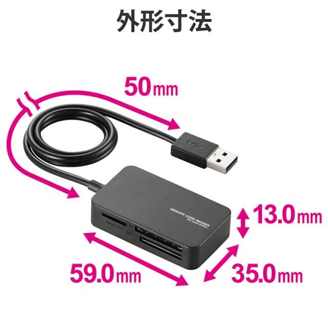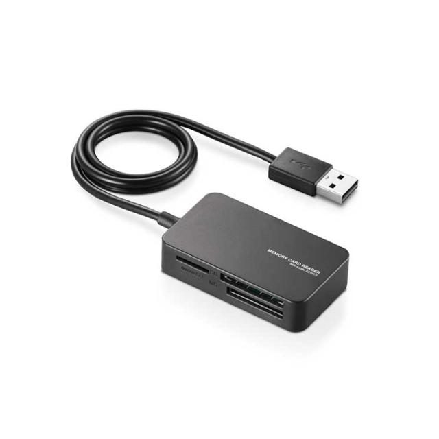 主要メディアに対応しながらコンパクトサイズを実現。持ち運びに便利なケーブル一体タイプの小型メモリリーダライタ。■インターフェイス:USB2.0 ■最大転送速度:USB2.0ハイスピード/480Mbps(理論値) ■コネクタ形状:USB[A](オス)x1 ■スロット数:4 ■対応メディア(SDメモリカード):SD(HighSpeed,ProHighSpeed,Class2,4,6,10)、Wii・DSi用、SDHC(Class2,4,6,10,UHS-I,UHS-)、SDXC(UHS-I)/miniSD、miniSDHC (Class2,4,6)※/TransFlash、microSD(UHS-I)、microSDHC(Class2,4,6,10)、microSDXC(※)別途専用アダプタ必要 ■対応メディア(マルチメディアカード):MMC、MMC4.0、セキュアMMC、RS-MMC、RS-MMC4.0/MMC micro※(※)別途専用アダプタ必要