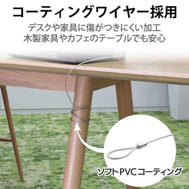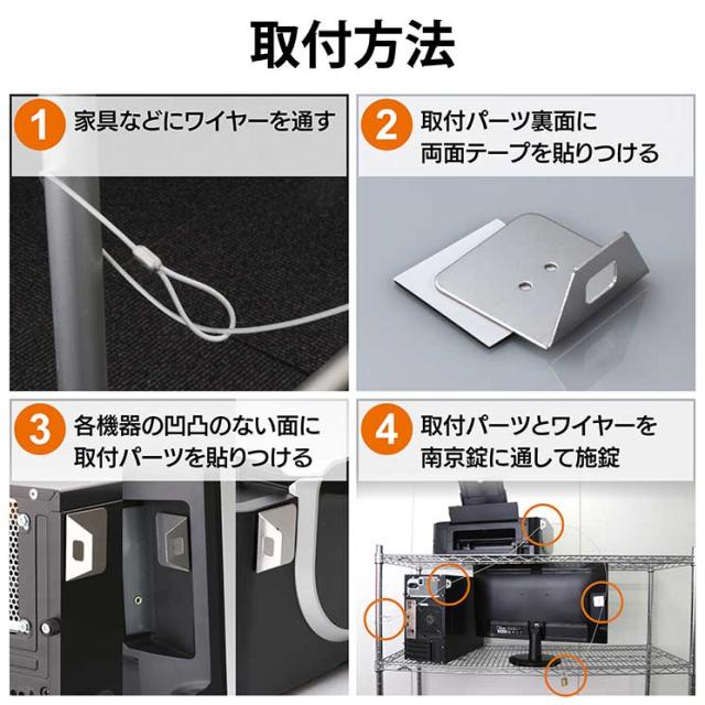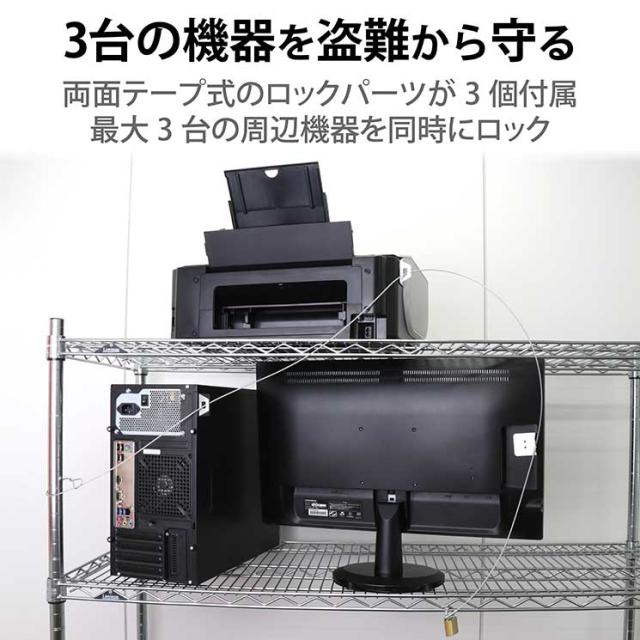 モニタ・CPU・プリンタなどをまとめて盗難から守ります。■製品種類:南京錠+ワイヤー ■対応スロットサイズ:その他:接着 ■通常、マスター、統一、その他:通常 ■セット内容:南京錠、カギ2本、取付パーツ×3個、両面シール×3個 ■寸法:南京錠:幅30×奥行12.5×高さ48.5mm、取付パーツ:幅40×奥行40×高さ20mm ■ワイヤー長さ:1.7m ■ワイヤー太さ:2.2mm ■ワイヤー材質:スチール+ソフトPVCコーティング ■ワイヤー色:シルバー