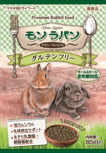 モンラパンシリーズ初のチモシー配合グルテンフリーフードです。腸まで届く生きた乳酸菌と酪酸菌を配合したプロバイオティクスフードです。また、食物繊維・海藻・パパイヤ抽出物が毛玉(ヘアボール)の排出を助けます。腸内のにおいを吸収する米胚芽大豆抽出物・樹木抽出物が尿臭を抑えます。ウサギの免疫に配慮して、β-グルカンと特殊卵黄粉末(グロビゲン)を配合したことにより、健康を維持します。