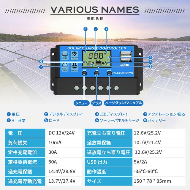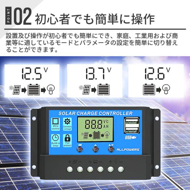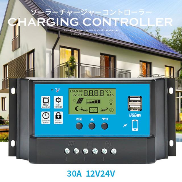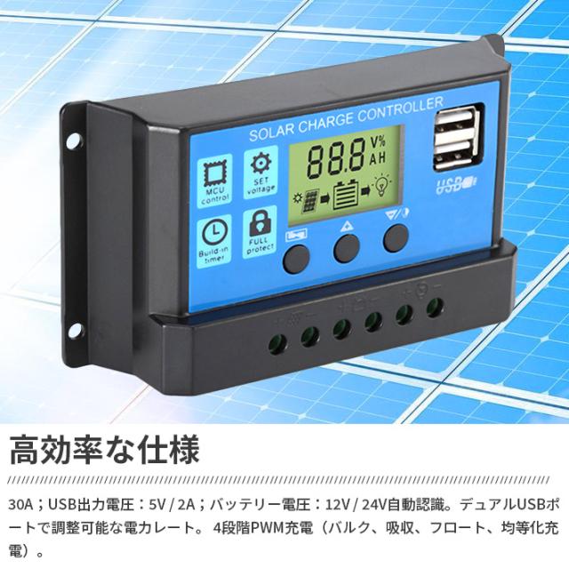 進化版 ソーラーチャージコントローラー 30A 12V24V鉛蓄電池車バッテリー充電コントローラー USBポート付き