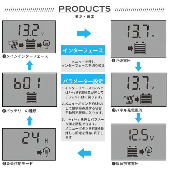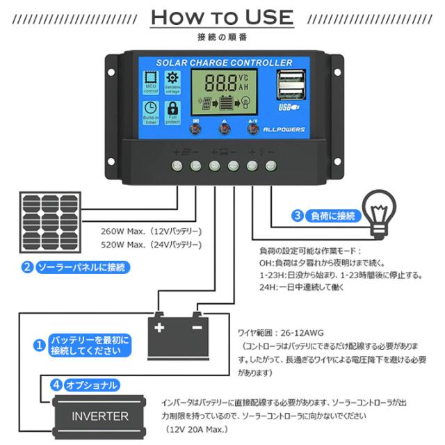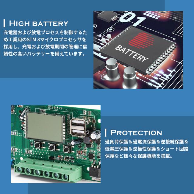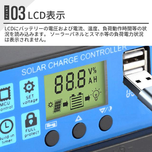 【高効率な仕様】定格放電電流:30A;USB出力電圧:5V / 2A;バッテリー電圧:12V / 24V自動認識。デュアルUSBポートで調整可能な電力レート。 4段階PWM充電(バルク、吸収、フロート、均等化充電)。 【自動調整できるバッテリー充電コントローラー】充電器および放電プロセスを制御するため工業用のSTM 8マイクロプロセッサを採用し、充電および放電期間の管理に信頼性の高いバッテリを備えています。