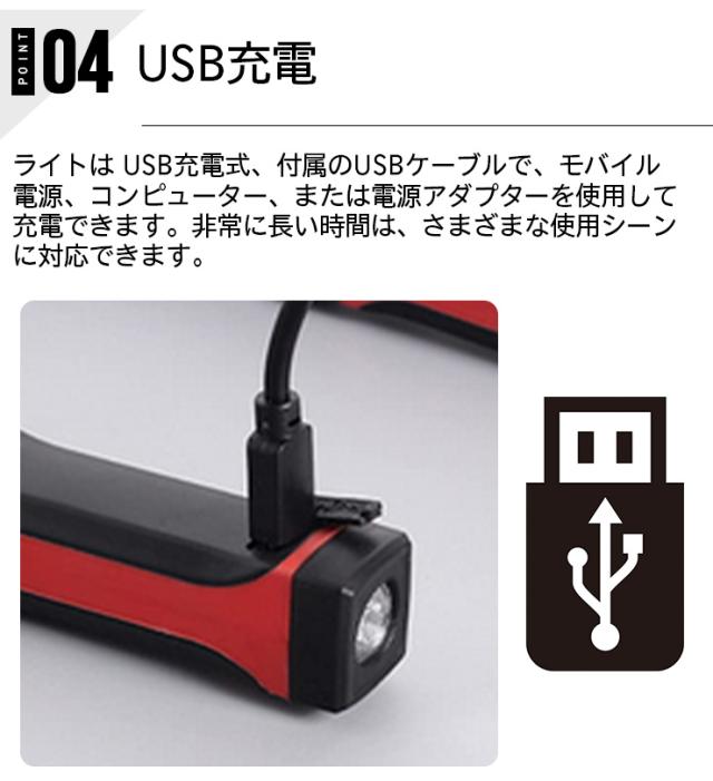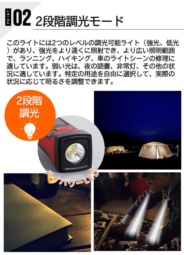 ● USB充電:ライトは USB充電式、付属のUSBケーブルで、モバイル電源、コンピューター、または電源アダプターを使用して充電できます。非常に長い時間は、さまざまな使用シーンに対応できます。● 2段階調光モード:このライトには2つのレベルの調光可能ライト(強光、低光)があり、強光をより遠くに照射でき、より広い照明範囲で、ランニング、ハイキング、車のライトシーンの修理に適しています。弱い光は、夜の読書、非常灯、その他の状況に適しています。特定の用途を自由に選択して、実際の状況に応じて明るさを調整できます。