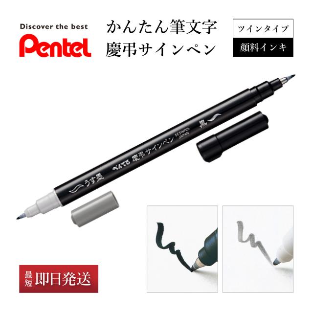 | | お悔やみもお祝いも、これ一本でOK。 ぺんてるのツインタイプの慶弔サインペンです。 「黒」と「うす墨」のツインタイプです。祝儀袋から、一般宛名書きまで使用できる「黒」(慶事用)と、香典袋等に使用できる「うす墨」(弔事用)がツインになっていますので、これ一本ですべての冠婚葬祭にご使用いただけます。 しっかりとしたペン先で、筆に不慣れな方でも簡単に扱えます。和紙の金封に書いてもにじみにくい、耐水性に優れた顔料インキを使用しています。 |