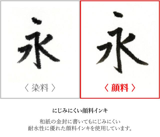 しっかりとしたペン先で、筆に不慣れな方でも簡単に扱えます。和紙の金封に書いてもにじみにくい、耐水性に優れた顔料インキを使用しています。