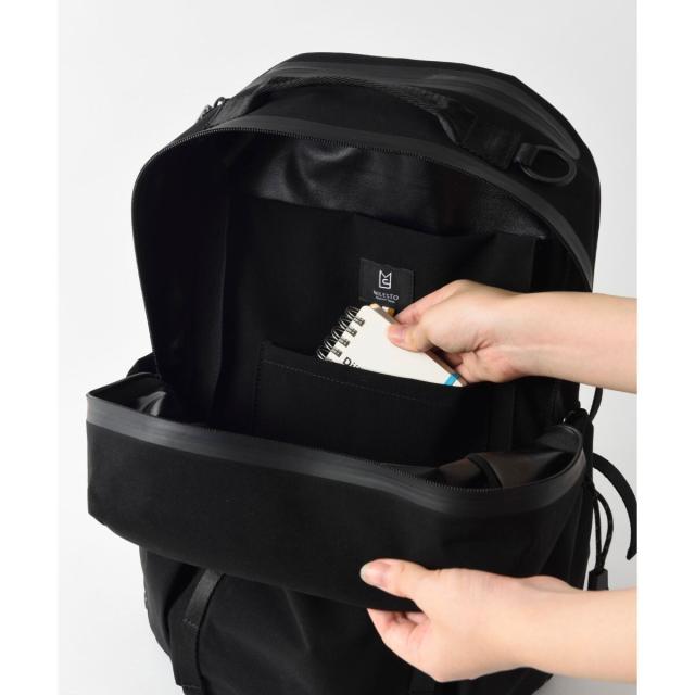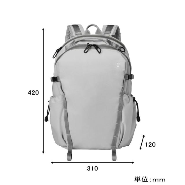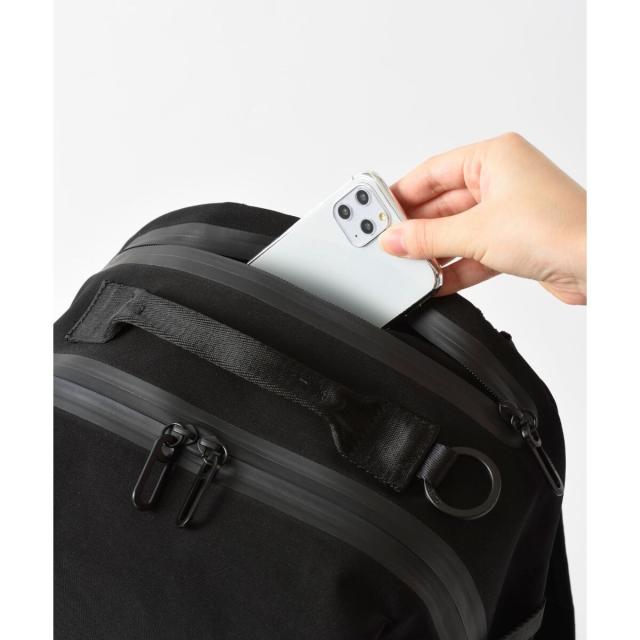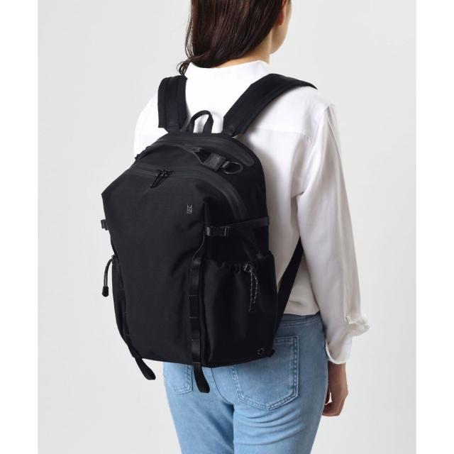 13インチまでのノートPCが収納できるバックパック。柔らかくマットな素材感がカジュアルなコーディネートにも合わせやすく、ジェンダーレスなデザイン。耐水圧2500mmの強撥水生地を使用。止水ファスナーにより高い撥水機能を実現しました。サイドのアジャスター機能付きバックルでバックパックの厚さを調節できます。外ポケットにはハトメを施し、万が一雨水が溜まっても水が抜ける仕組みです。