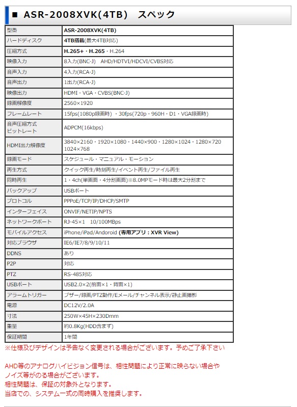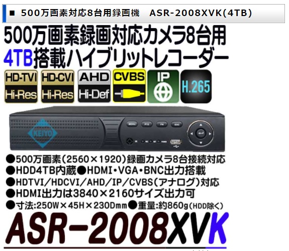 ASR-2008XVK(4TB)は、HDTVI/HDCVI/AHD/IP/CVBS入力対応 500万画素録画4TB搭載8ch防犯用録画機です。