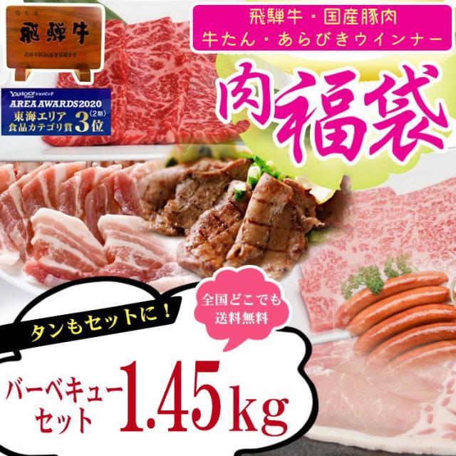飛騨牛入り バーベキューセット 1.45kg 約5〜6人前 飛騨牛400g 国産豚肉600g バーベキュー 厚切り牛タン芯200g あらびきポークウインナー250g 送料無料 BBQ 焼肉 焼き肉 飛騨牛 福袋 和牛 肉