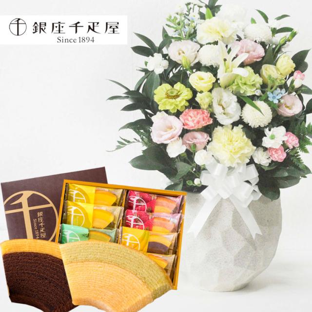 お供え花とスイーツセット 洋花を使った旬のおまかせ お供え花「鞠花アレンジ」+ 【銀座千疋屋】 銀座フルーツクーヘンギフトセット お供え お悔み 仏花 生花 法事 命日 メッセージカード FKAASW