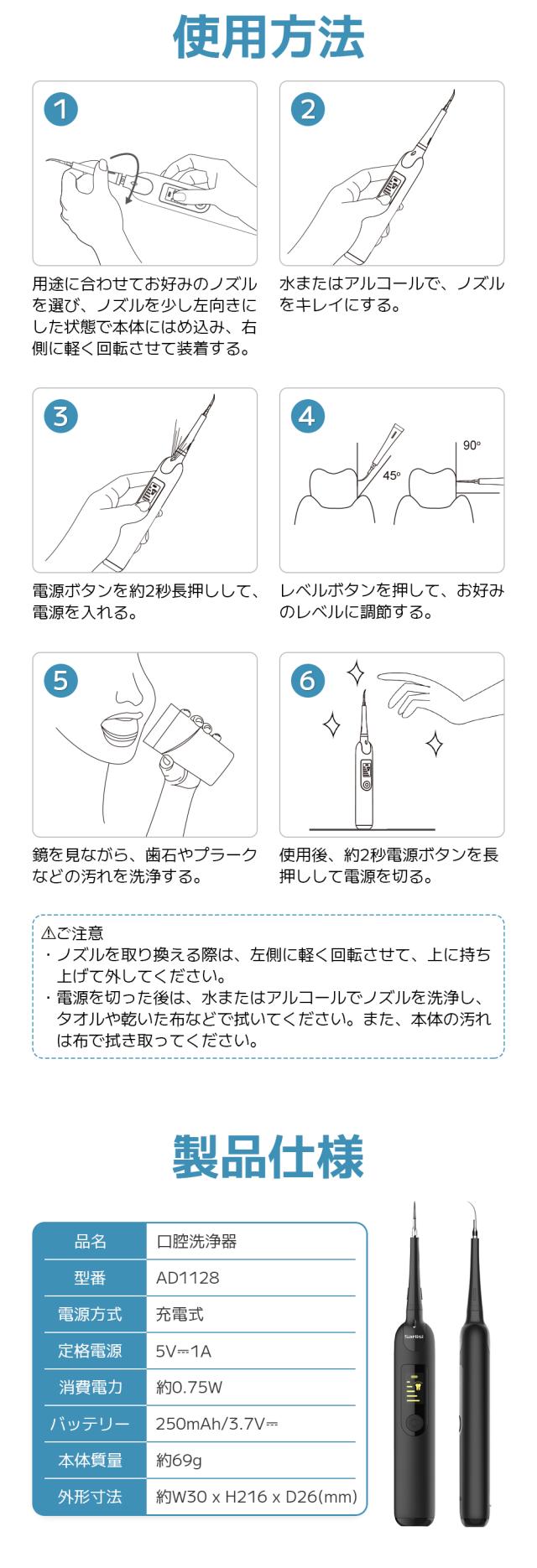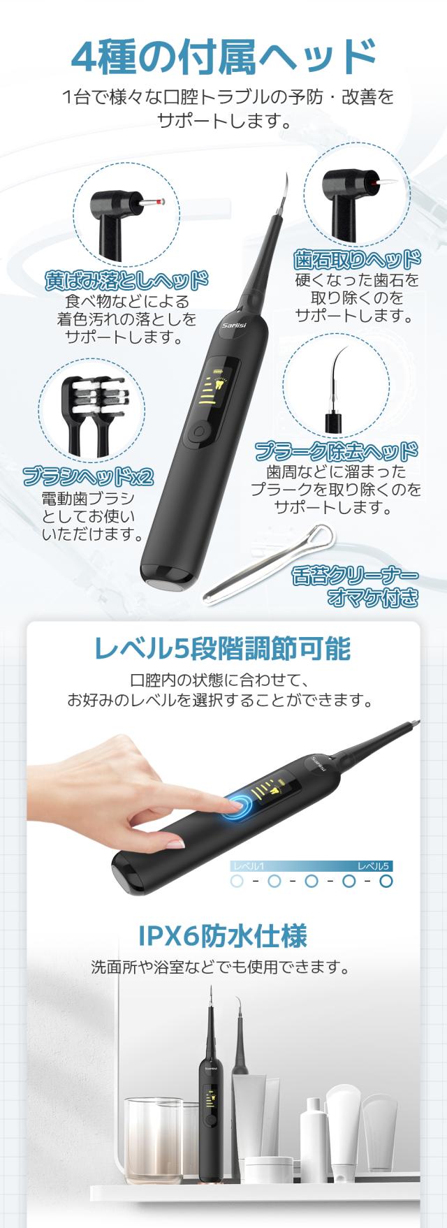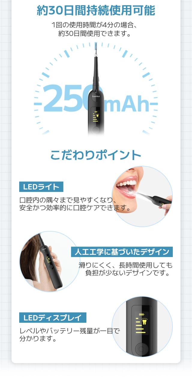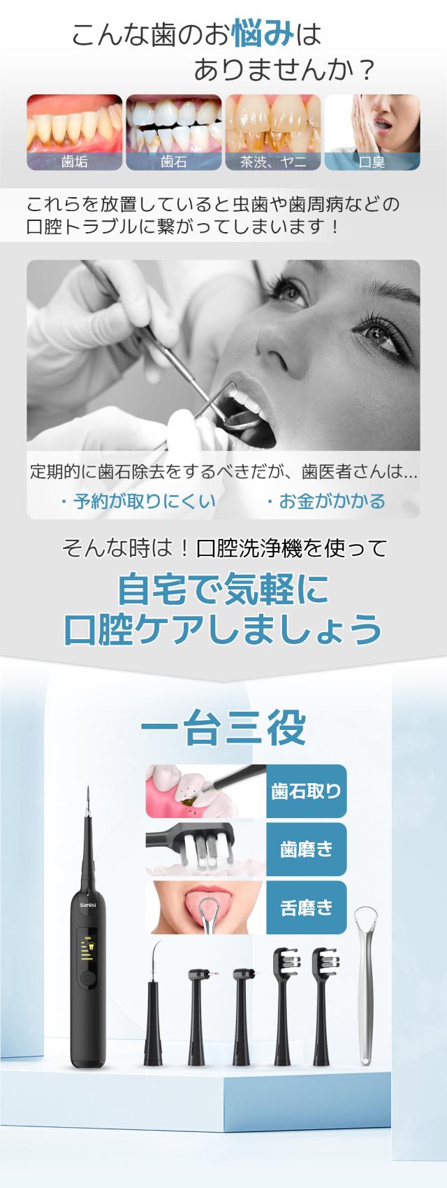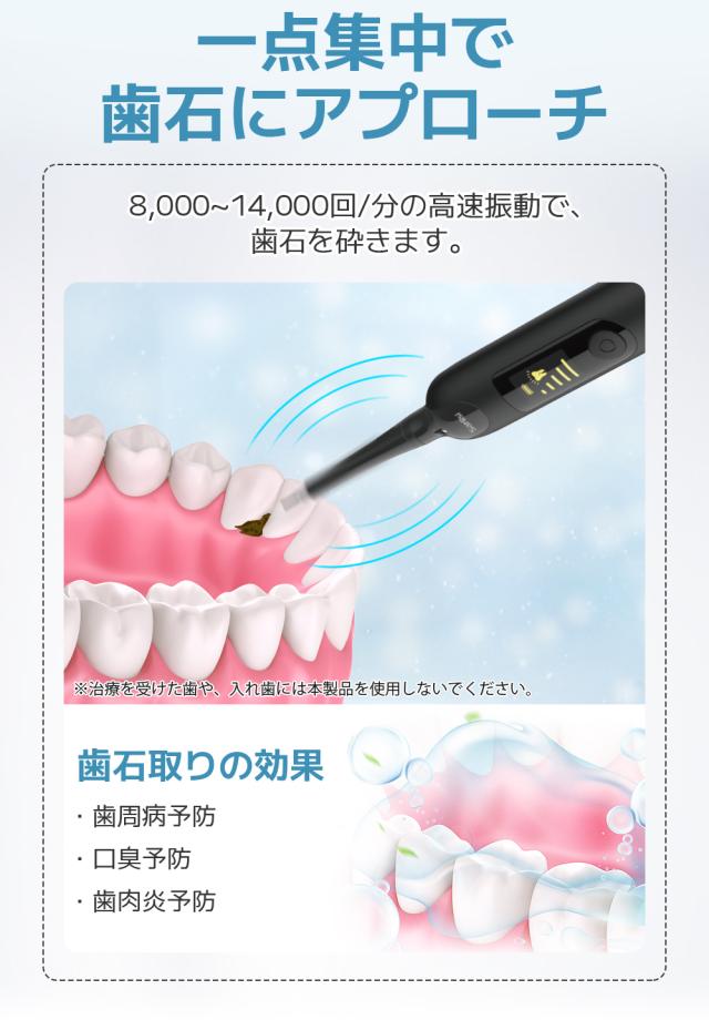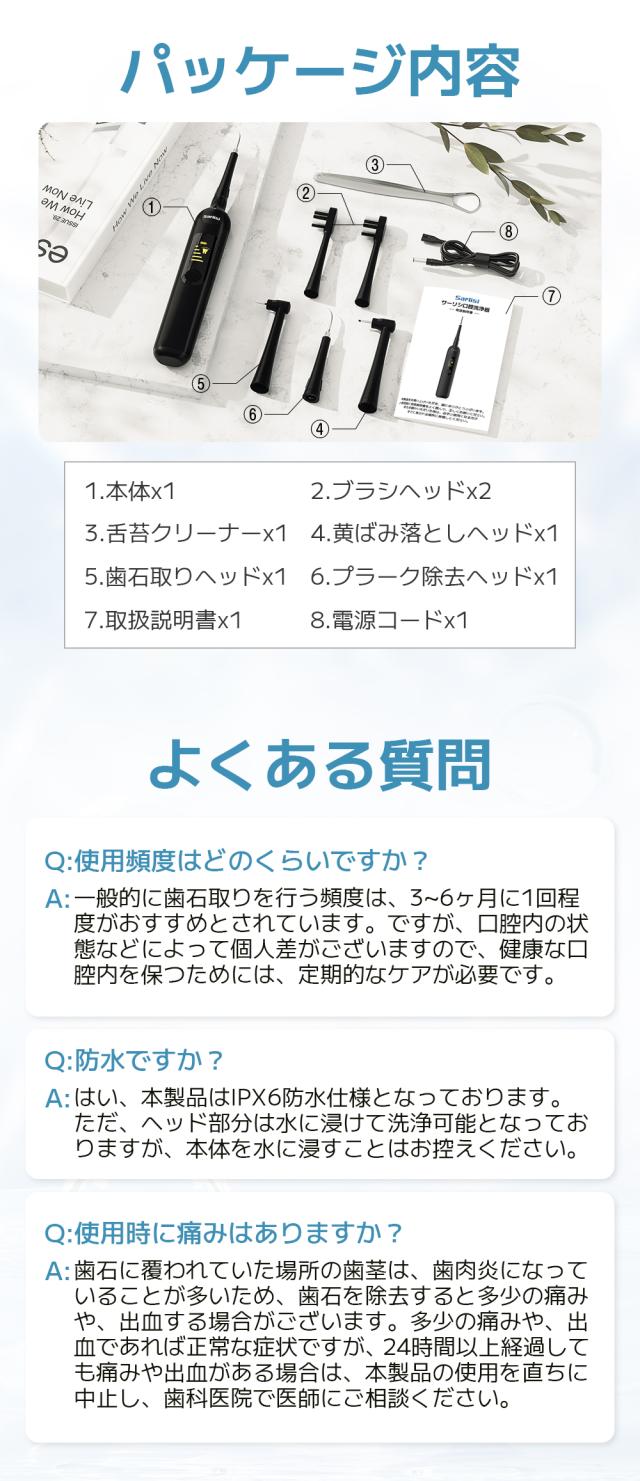 - 使用後どうなるか半信半疑で購入しました。けっこうな歯石が歯茎の痛みもなく綺麗になりました!購入前は少し不安もありましたが痛みもなく綺麗になるし、付属のお品も沢山付いているので購入して良かったです!