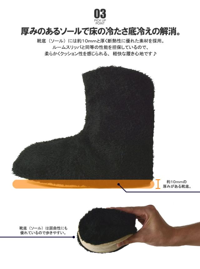 本品の靴底は約10mmと厚く断熱性に優れ、ルームスリッパを同等の性能を担保しているので、