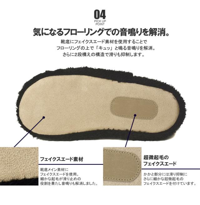 かかと部分にはさらに細かな超微起毛のフェイクスエードを付け、2段構えで滑りを抑制。