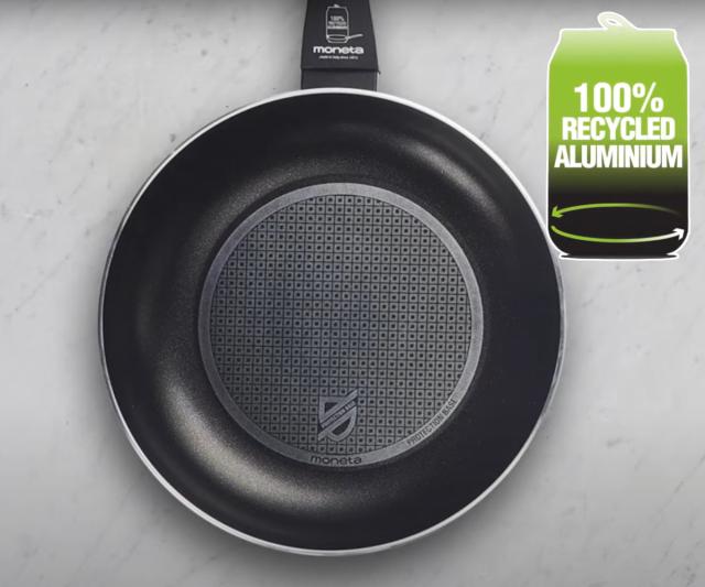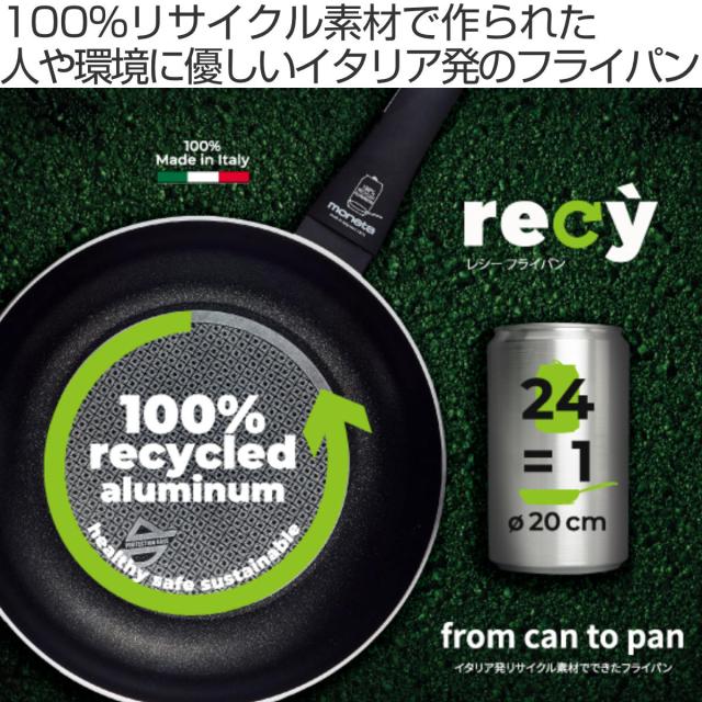 recyはモネータ社(イタリア)が開発した100%リサイクル素材からできたフライパンです。本体部分に使用されているリサイクルアルミは100%回収されたアルミ缶からできています。
