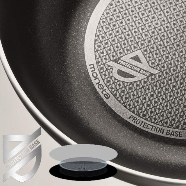 特許を取得したノンスティックコーティングである「PROTECTION BASE」は、従来の3層コーティングの上にマイクロクリスタルを含有したトップコートと摩耗に強い特殊フィルムを重ねた多層構造(5層)になっており「PROTECTION BASE」を使用しない従来品と比較して約2倍の磨耗強度を実現しています。