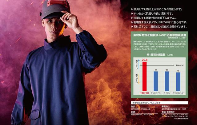 村上被服のHONOシリーズは、JISの規格にのっとった各種試験の基準をクリアしており、難燃性の評価には自信があります!