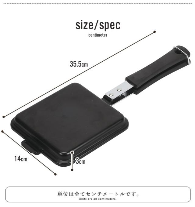 | 熱伝導率の良い鉄製ホットサンドメーカー。 お好みの具を挟んで焼くだけで、カフェ風の具沢山ホットサンドが簡単に作れます。 食パンがそのまま入るサイズなので、耳までおいしく食べられます。 ※耳はつぶれません。 本体内面はこびりつきにくいフッ素樹脂加工でお手入れも簡単。 上面と下面を2つに分解することができるので、2枚に分けてフライパンとしても使えます。 ●おすすめの食パンきり数は6〜8枚切り (具材が多いときは8枚切り推奨) |