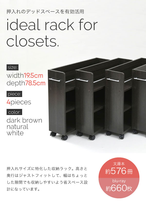 キャスター付き 収納 押入れ ラック 本棚 4個セット 幅19.5 奥行78 .5 隙間 スリム ワゴン 棚 3段 大容量