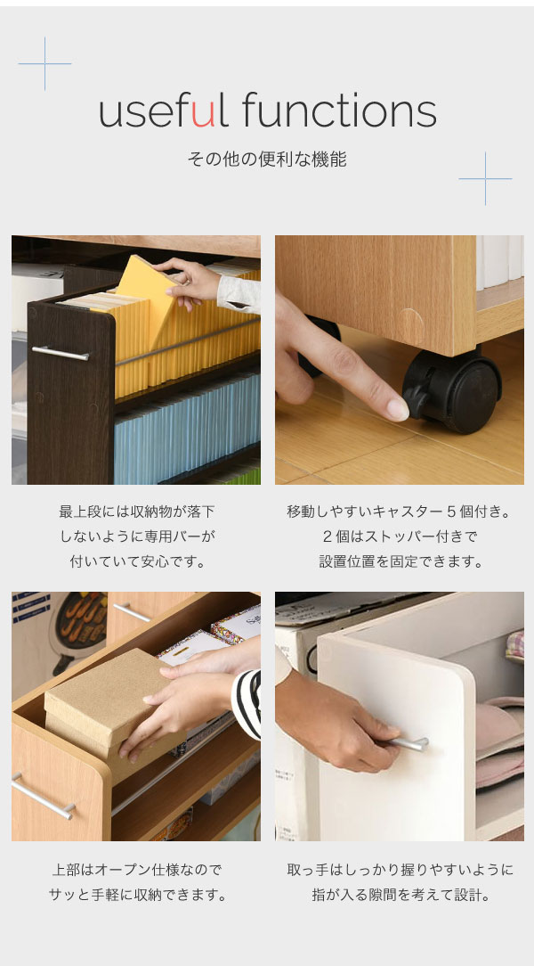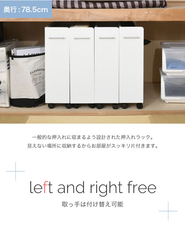 キャスター付きの便利な押入れラック4個組。取っ手はどちらにも取り付け可能なので、収納箇所の向きは左右入れ替えできます。本やメディア類や、日用品のストックなどの収納にぴったり。押入れ内のスペースを有効活用するのでお部屋をすっきり片付けられます。