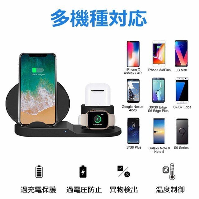 【安全性】Qi ワイヤレス充電器-QI標準のSTチップを内蔵し、温度の保護や電圧電流など多種多様な安全保護機能を備え、充電時でのスマホの安全性を保ちます。さらにスマホに傷つきにくい優れたABS材料を使用しています。3 in 1充電スタンドに疑問やご満足頂けない場合、すぐにご連絡下さい。最適な改善策を提供致します。ご購入頂いた方に満足してもらえるよう最善尽くします。