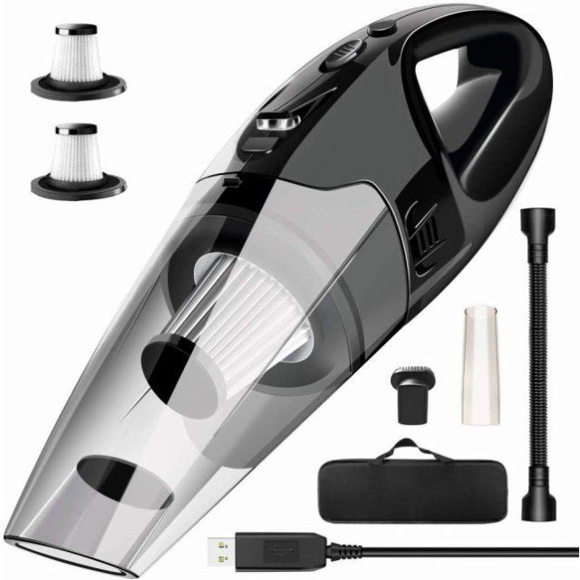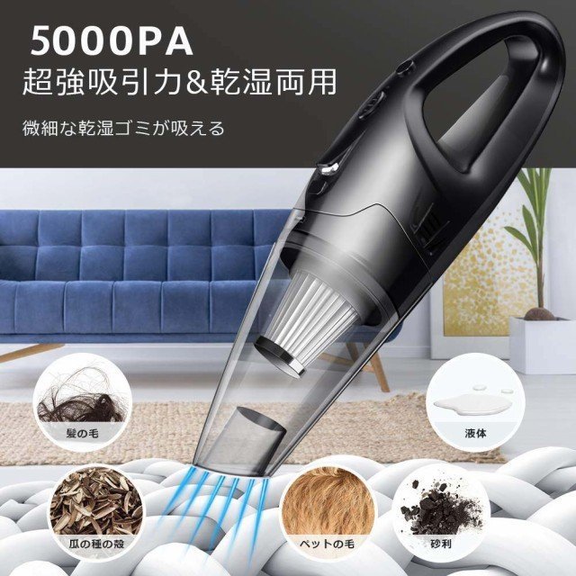 ハンディクリーナーは120W高性能モーターを搭載し、5000PA超強吸引力でパン屑、紙屑、猫砂、ガス、水、ミルク等乾湿を問わず、家でも車でもあっという間に、きれいに掃除できます。