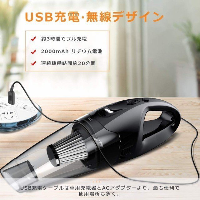 【コードレス充電式】コードレス式なので邪魔にならず、自由に移動して掃除することができます。線を巻きつけることなどの問題を解決して、とても簡単に使用できます。USB充電ケーブルは車用充電器とACアダプターより、最も便利で、使用場所も多いです。※充電するにあたって、LEDインジケータランプが充電状態を示します。充電時は赤いライトが点滅し、フル充電になると、緑ライトが点灯 します。