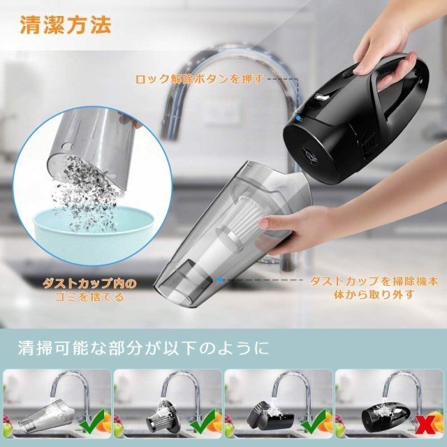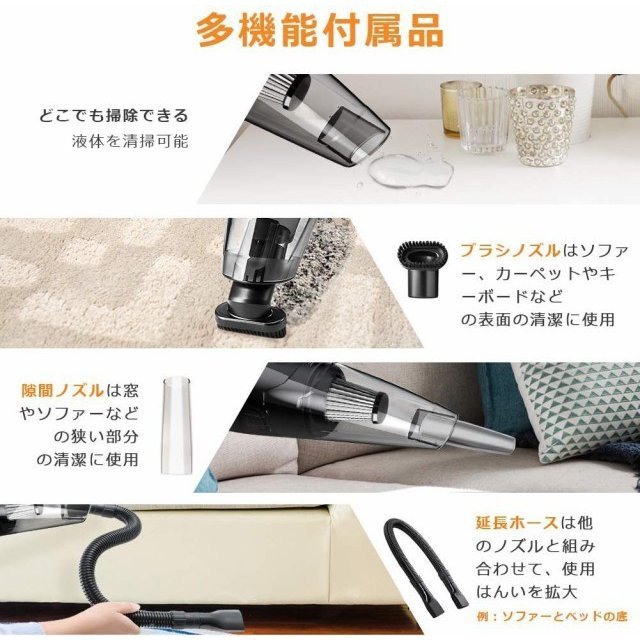 【超強吸引力】5000PAの強力吸引力と120Wのモーターにより徹底的に掃除することができます。超強吸引機能は細かな粉塵を吸い上げることができます。様々の場所で大活躍!髪の毛、パン屑、小麦粉、窓サッシ、玄関、階段の隅や車シートの隙間などにも吸い込みます。ジュース、牛乳や水などの液体もOKです!