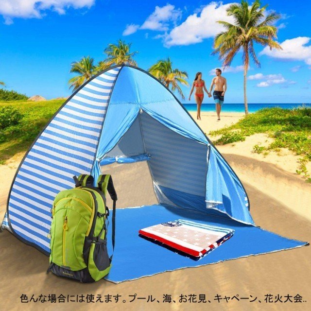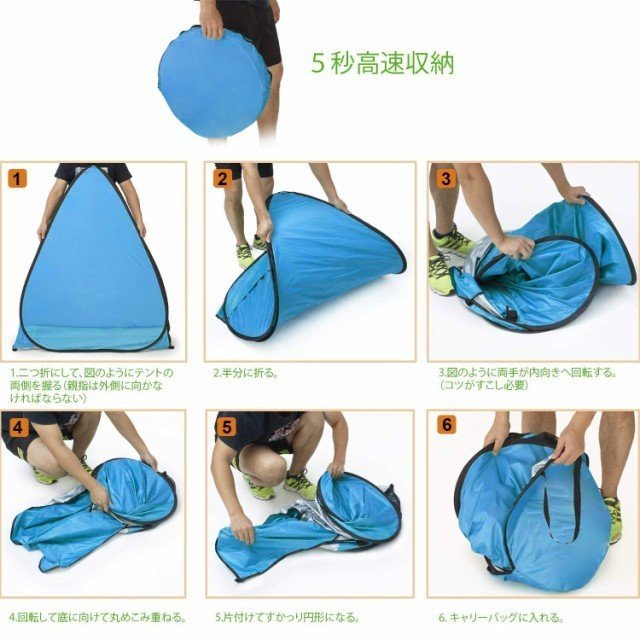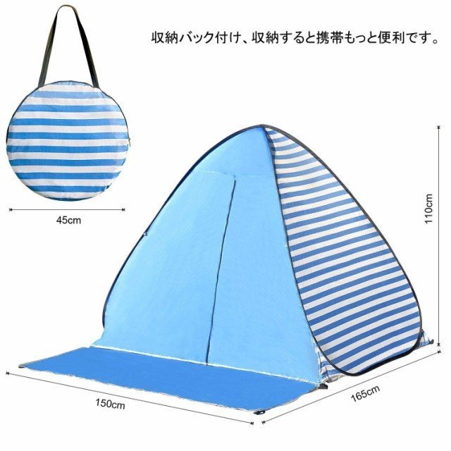 【製品仕様&ワンタッチで楽々】重量:1kg 展開サイズ:150X165X110 cm 収納時 : (約)直径45cm×厚さ5cm 付属品:フルクローズサンシェードテント本体 / ペグ6本 / 専用収納バッグ 推薦:2-3人用(一名大人と二名子供あるいは二名大人)。ワンタッチ式で、組み立てが不要、パッと開くだけ!コツをつかめば、わずか10秒でも収納できます。プロな人ではないでも、小学生と女性でも簡単に設置することができます。