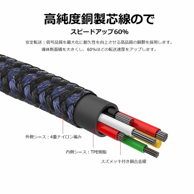 【錫をメッキした純銅線】:ケーブルの内部は高純度線芯を使用、安全性能が高く、良い導電性を持ち、短路の心配はないです。電気抵抗が低く、高効率な充電が保証できます。また、発熱などの問題がなく、長時間に使えます。※充電用ケーブルなので、充電のみ対応で、データ通信機能がありません。予めご了承願います。
