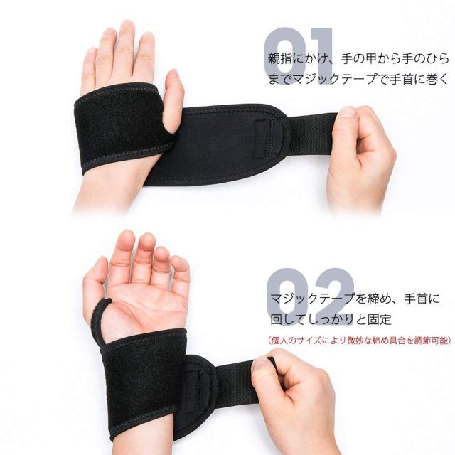調節できるフリーサイズ!肌にやさしい弾性素材で作られ、個人の手首周りによりマジックテープで固定し、包み込むサポート感を実現しました。