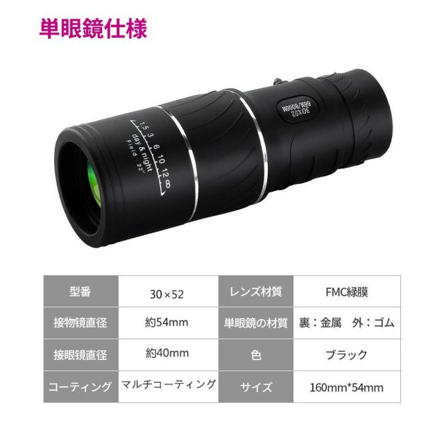 単眼鏡 30x52高倍率 望遠鏡 昼夜兼用 美術館 観戦 観察 運動会 コンサート 旅行 アウトドア スポーツ ライブ 夜景 博物館めぐり