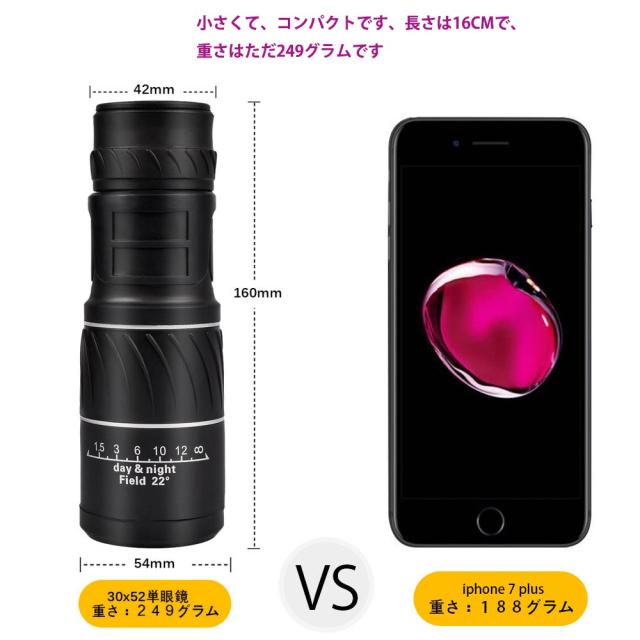 【高倍率単眼鏡性能】単眼鏡倍率:30倍。単眼鏡フォーカスシステム:ダブルフォーカス。単眼鏡接眼レンズ直径:42MM 。単眼鏡対物レンズ直径:54mm。単眼鏡重量:249グラム。