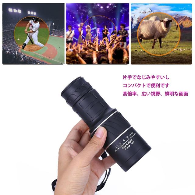 我社の単眼鏡は小さくて、コンパクトです。単眼鏡の長さは16CMで、片手でなじみやすいです。高倍率単眼鏡はどこに置いても省スペースです。ストライプ用と三脚架用の穴も付きますので、高倍率単眼鏡は持ち歩きやすいです。屋外で使いやすいです。単眼鏡は気楽な旅を上げます。