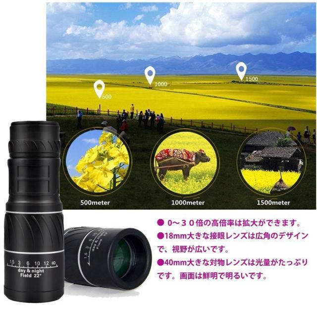 単眼鏡のコーティング技術は画面の明るさを高めますし、またイメージング色度もアップします。高倍率単眼鏡の画面はとてもはっきりです。