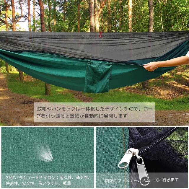 【蚊帳を張るロープが不要&蚊帳付き360°保護】蚊帳をロープで張る型式ハンモックより、蚊帳を張るロープが不要で蚊帳一体型で便利で、取り付けも手間かかりません。蚊帳付きハンモックが虫対策にばっちりです。アウトドアで不快な蚊をシャットアウトしてます。ロープなしで蚊帳が自動展開します。裏返せば普通のハンモックとしても利用できます。