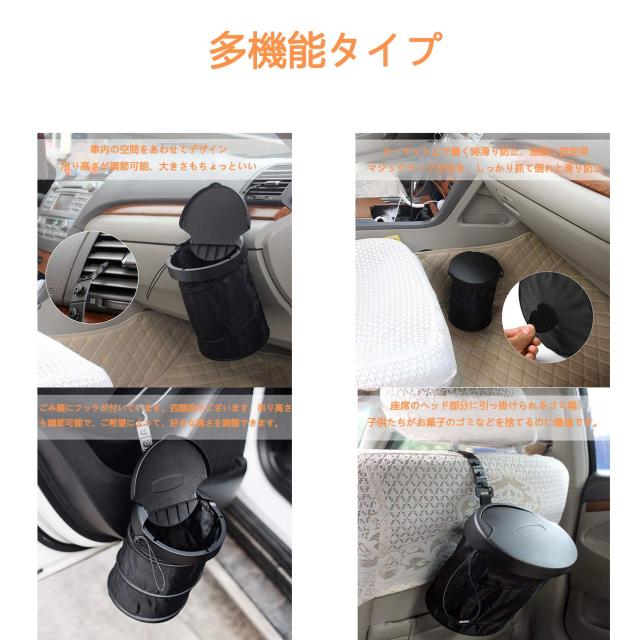 【多機能タイプ】 お客様のご使用によって、蓋は取り外せます。ごみ箱にフックが付いています。四階段がございます。吊り高さも調節可能で、ご希望によって、好きな高さを調整できます。車内の座席やフックなどいろいろな所に吊れます。カーマット上で置く時、底部に固定用マジックテープが付き、しっかり抓て倒れと滑り防止。