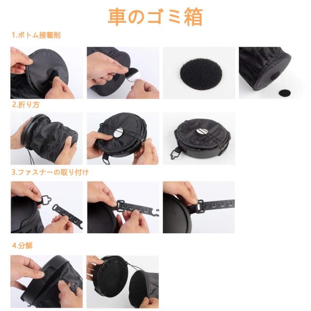 お客様のご使用によって、蓋は取り外せます。ごみ箱にフックが付いています。四階段がございます。吊り高さも調節可能で、ご希望によって、好きな高さを調整できます。車内の座席やフックなどいろいろな所に吊れます。カーマット上で置く時、底部に固定用マジックテープが付き、しっかり抓て倒れと滑り防止。