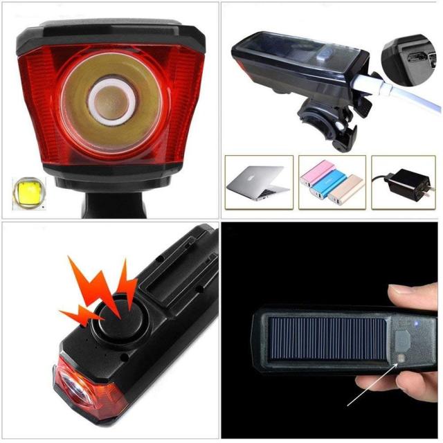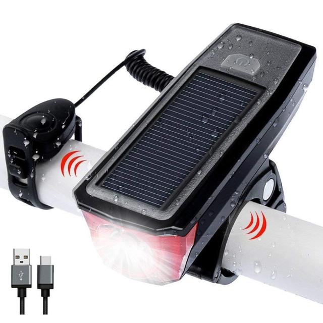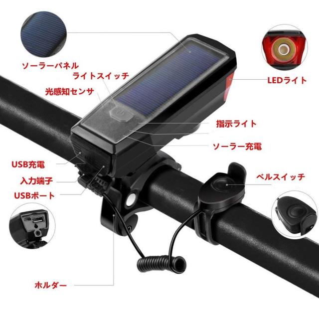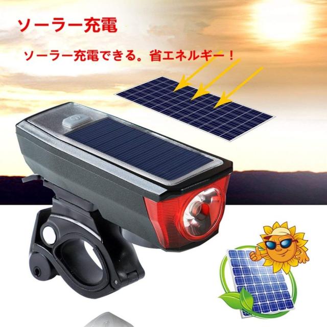 自転車ライト LED ヘッドライト 高輝度 ソーラー充電&USB充電式 IPX6 防水 自転車ライト 小型 軽量 LEDライト 自転車用ベル