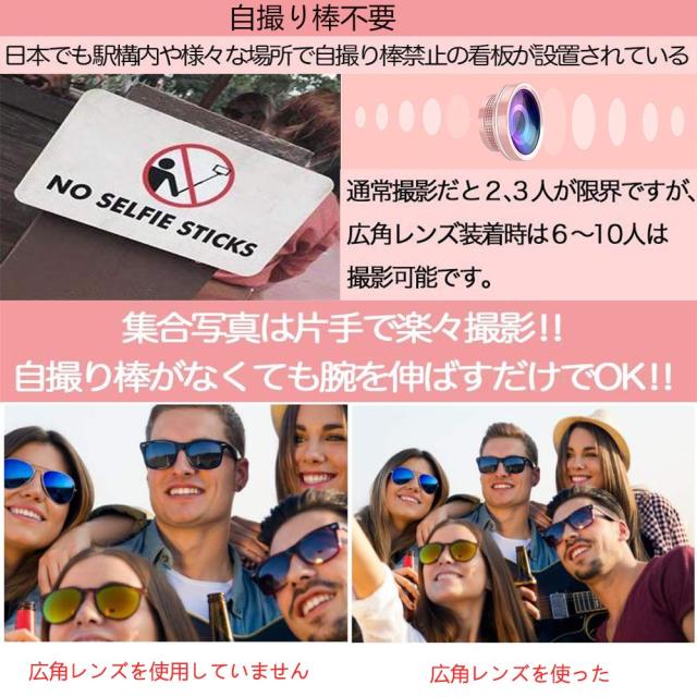 【多機能】スマートフォン用カメラレンズ 、風景撮影、片手撮影、大人数での集合写真、自撮り撮影、SNS投稿用写真、綺麗に撮影して、思い出も綺麗に残せるをぜひご堪能ください。自撮りの時,このスマホ用カメラレンズがあれば、自撮り棒はもう必要なし!あなたのスマートフォンに取り付けるだけで、自撮り棒と同じ距離感で写真撮影?動画撮影が可能になりました。