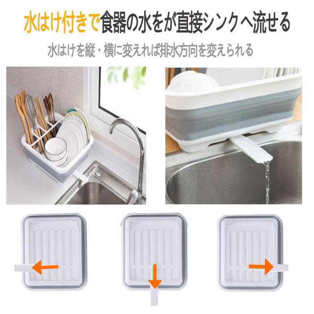 【可動式の水はけ付きで食器の水を直接シンクへ流せる】 水切りカゴは、水はけ付きで食器の水を直接シンクに流すことが出来ます。水はけは可動式なので、設置場所に合わせて縦向き?横向きどちらでも排水できます。シンクに合わせて自由にレイアウトしてください。