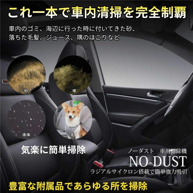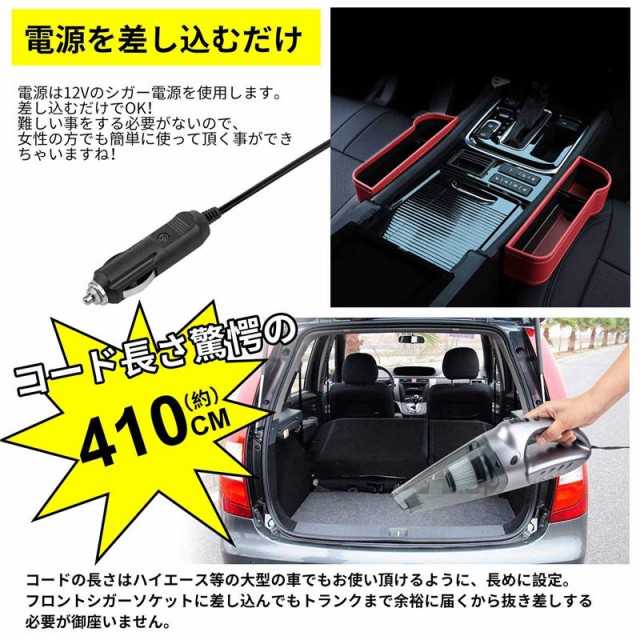 自動車の中をいつもきれいに。たまに気が向いたときに。気付いたときにシガーソケット(DV12V専用)に差し込めばいつでも簡単に車内の掃除ができます。またバッテリーを内蔵していないので本体は充電式ハンディクリーナーに比べると軽量となっており女性の方も長時間使用でも疲れづらい重量となっております。効率的に隅々まで掃除をする、小型の車用掃除機です。掃除する場合に合わせて、延長ホースやパワーブラシなど各種ノズルの使い分けが可能。液体や濡れたゴミも吸い取れるドライ&ウェット両用タイプです。ブラシノズル付きで、フロアマットのゴミをかき出して吸い取ります。車用掃除機の使用後は、専用の収納バックにコンパクトに方付けられます。約5mのロングケーブルを採用しているので、愛車の中を隅々まで綺麗に出来ます。ゴミ捨ては手間がかからず簡単。お手入れの際は、水洗いOKなのもうれしい。